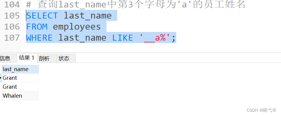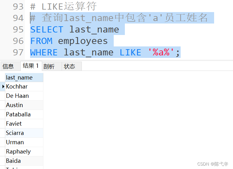 LIKE运算符主要用来匹配字符串,通常用于模糊匹配,如果满足条件则返回 1 ,否则返回 0。如果给定的值或者匹配条件为 NULL ,则返回结果为 NULL 。通配符:“%”:匹配0个或多个字符。“_”:只能匹配一个字符。转义字符:“”![]()