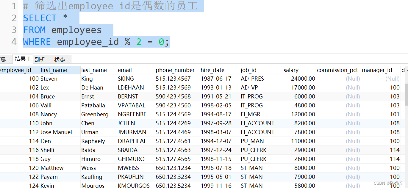 筛选出employee_id是偶数的员工