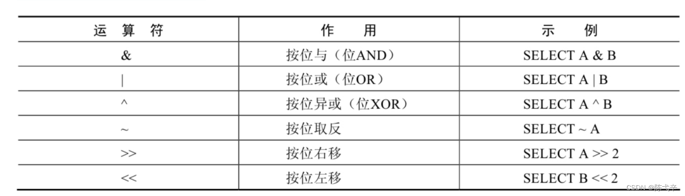 位运算符是在二进制数上进行计算的运算符。位运算符会先将操作数变成二进制数,然后进行位运算, 最后将计算结果从二进制变回十进制数。MySQL支持的位运算符如下:![]()