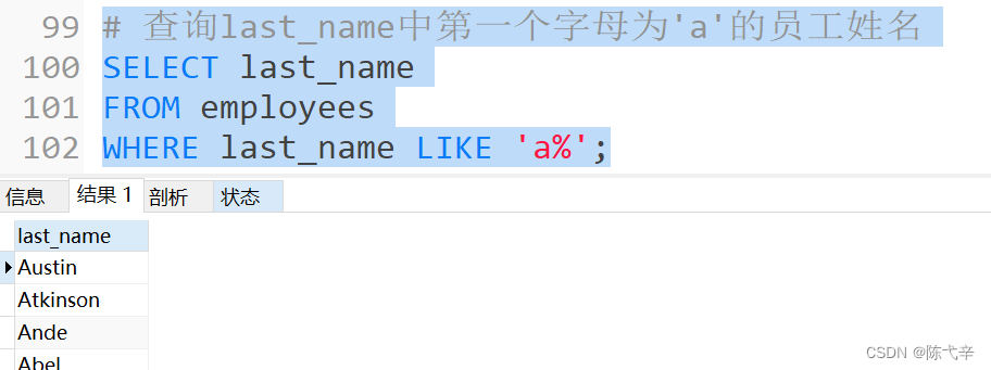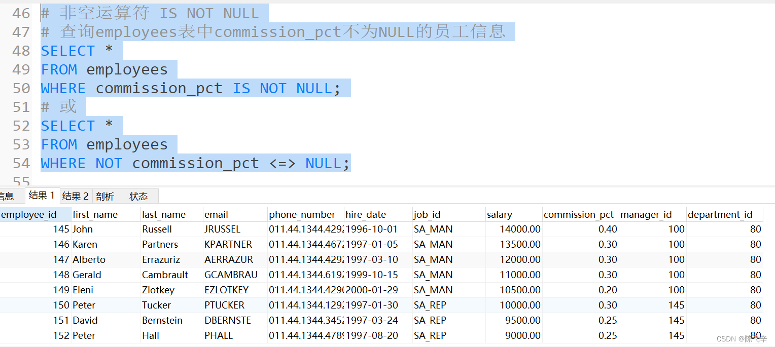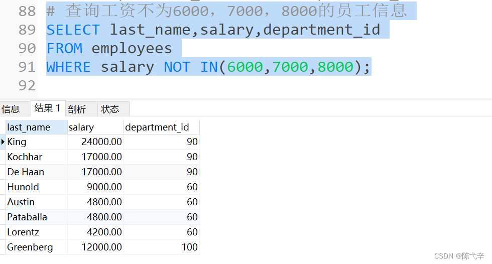 【题目】# 1. 选择工资不在 5000 到 12000 的员工的姓名和工资# 2. 选择在 20 或 50 号部门工作的员工姓名和部门号# 3. 选择公司中没有管理者的员工姓名及 job_id# 4. 选择公司中有奖金的员工姓名,工资和奖金级别# 5. 选择员工姓名的第三个字母是 a 的员工姓名# 6. 选择姓名中有字母 a 和 k 的员工姓名# 7. 显示出表 employees 表中 first_name 以 'e' 结尾的员工信息# 8. 显示出表 employees 部门编号在 80-100 之间的姓名、工种# 9. 显示出表 employees 的 manager_id 是 100,101,110 的员工姓名、工资、管理者 id# 答案 # 1.选择工资不在5000到12000的员工的姓名和工资 SELECT last_name,salary FROM employees WHERE salary NOT BETWEEN 5000 AND 12000; # 2.选择在20或50号部门工作的员工姓名和部门号 SELECT last_name,department_id FROM employees WHERE department_id IN(20,50); # 3.选择公司中没有管理者的员工姓名及job_id SELECT last_name,job_id FROM employees WHERE manager_id IS NULL; # 4.选择公司中有奖金的员工姓名,工资和奖金级别 SELECT last_name,salary,commission_pct FROM employees WHERE commission_pct IS NOT NULL; # 5.选择员工姓名的第三个字母是a的员工姓名 SELECT last_name FROM employees WHERE last_name LIKE '__a%'; # 6.选择姓名中有字母a和k的员工姓名 SELECT last_name FROM employees WHERE last_name REGEXP '[a]' AND last_name REGEXP '[K]'; # 或 SELECT last_name FROM employees WHERE last_name LIKE '%a%k%' OR last_name LIKE '%k%a%'; # 7.显示出表 employees 表中 first_name 以 'e'结尾的员工信息 SELECT last_name FROM employees WHERE last_name REGEXP 'e$'; # 或 SELECT last_name FROM employees WHERE last_name LIKE '%e'; # 8.显示出表 employees 部门编号在 80-100 之间的姓名、工种 SELECT last_name,job_id FROM employees WHERE department_id BETWEEN 80 AND 100; # 9.显示出表 employees 的 manager_id 是 100,101,110 的员工姓名、工资、管理者id SELECT last_name,salary,manager_id FROM employees WHERE manager_id IN(100,101,110);资料来源:http://www.atguigu.com