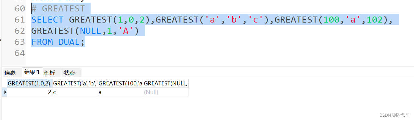 最大值运算符语法格式为: GREATEST( 值 1 ,值 2 , ... ,值 n) 。其中, n 表示参数列表中有 n 个值。当有 两个或多个参数时,返回值为最大值。![]()
