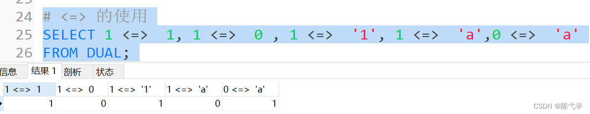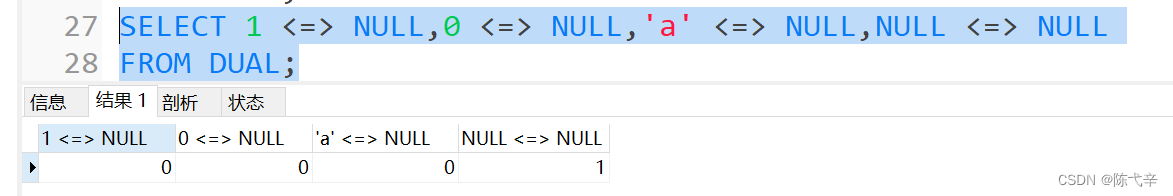 安全等于运算符(<=>)与等于运算符(=)的作用是相似的, 唯一的区别 是‘<=>’可以用来对NULL进行判断。在两个操作数均为NULL时,其返回值为1,而不为NULL;当一个操作数为NULL 时,其返回值为0,而不为NULL。![]()