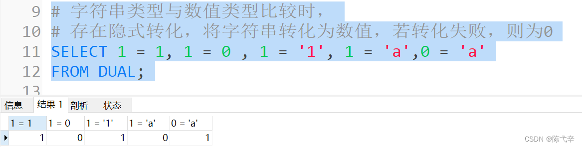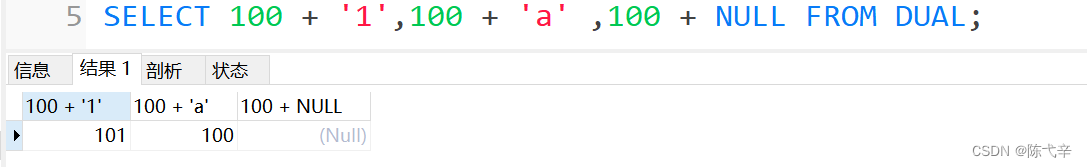 4.在Java中,+的左右两边如果有字符串,那么表示字符串的拼接。但是在MySQL中+只表示数 值相加。如果遇到非数值类型,先尝试转成数值(隐式转换),如果转失败,就按0计算。(补充:MySQL 中字符串拼接要使用字符串函数CONCAT()实现)