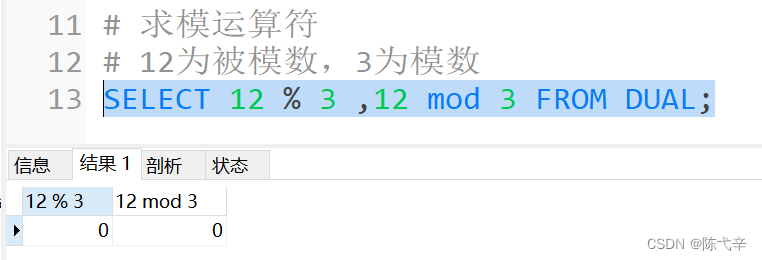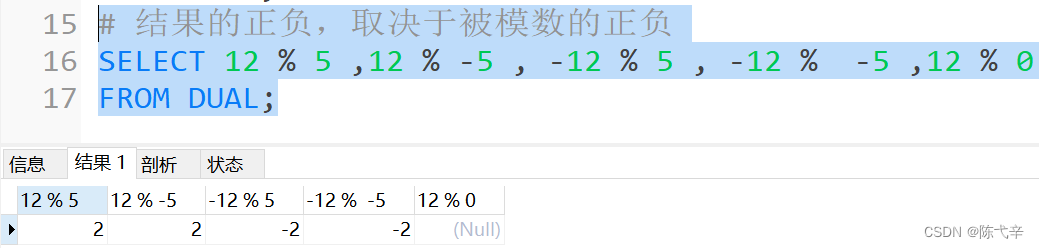 1.一个数乘以整数1和除以整数1后仍得原数;2.一个数乘以浮点数1和除以浮点数1后变成浮点数,数值与原数相等;3.一个数除以整数后,不管是否能除尽,结果都为一个浮点数;4.一个数除以另一个数,除不尽时,结果为一个浮点数,并保留到小数点后4位;5.乘法和除法的优先级相同,进行先乘后除操作与先除后乘操作,得出的结果相同。6.在数学运算中,0不能用作除数,在MySQL中,一个数除以0为NULL。![]()