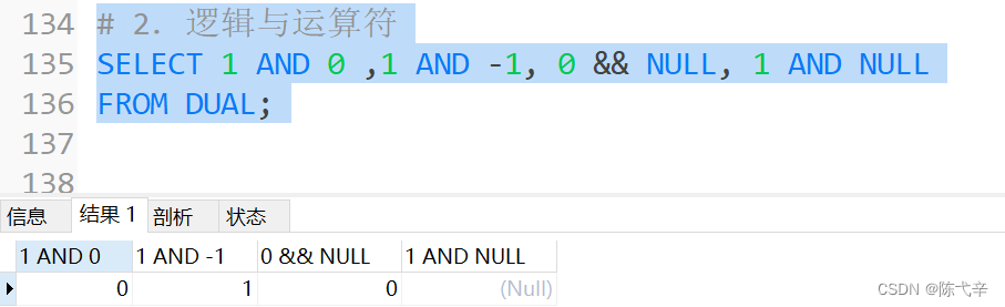 逻辑与(AND或&& )运算符是当给定的所有值均为非0值,并且都不为NULL时,返回1;当给定的一个值或者多个值为0时则返回0(0 && NULL 返回0);否则返回NULL。![]()