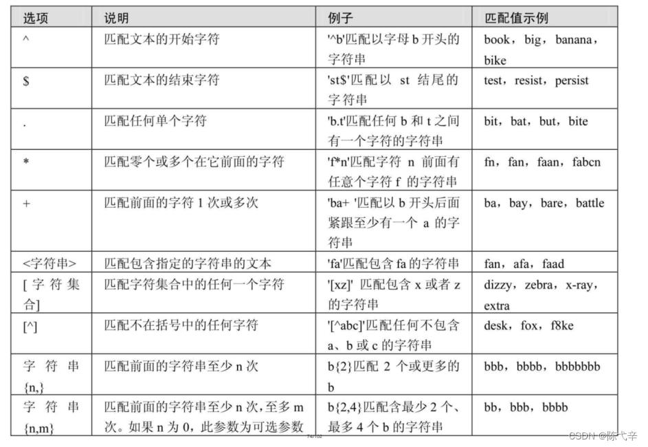 REGEXP运算符用来匹配字符串,语法格式为: expr REGEXP 匹配条件 。如果expr满足匹配条件,返回 1;如果不满足,则返回0。若expr或匹配条件任意一个为NULL,则结果为NULL。MySQL中使用 REGEXP 关键字指定正则表达式的字符匹配模式。下表列出了 REGEXP 操作符中常用字符匹配 列表。![]()