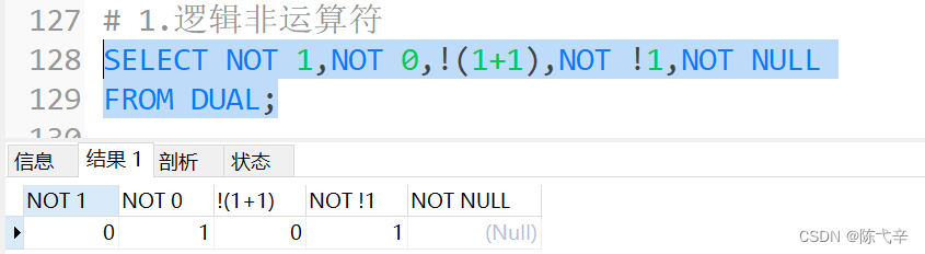 逻辑非(NOT 或!)运算符表示当给定的值为0时返回1;当给定的值为非0值时返回0;当给定的值为NULL时,返回NULL。![]()