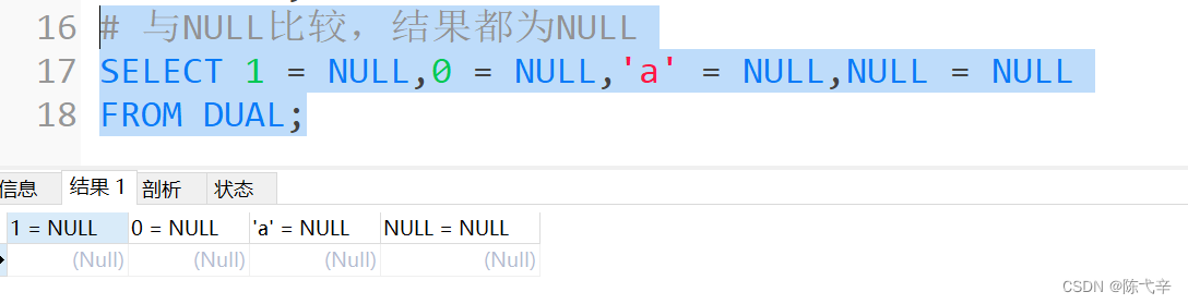 4.如果等号两边的值、字符串或表达式中有一个为NULL,则比较结果为NULL。![]()