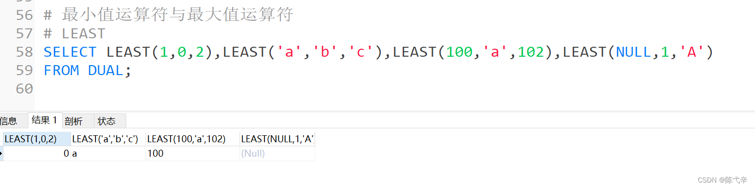 最小值运算符( LEAST )语法格式为:LEAST( 值 1 ,值 2 , ... ,值 n) 。其中, “ 值 n” 表示参数列表中有 n 个值。在有两个或多个参数的情况下,返回最小值。