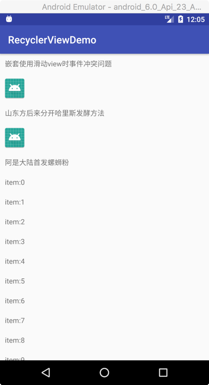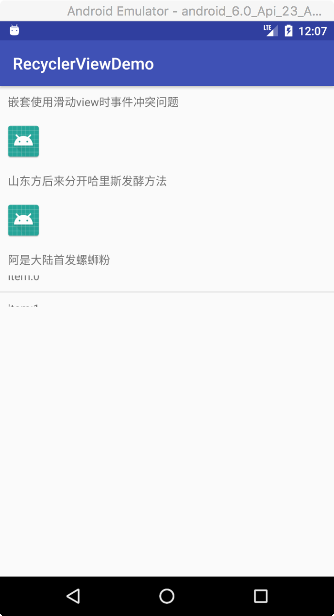 结论:6.0模拟器上recyclerview的数据显示完全,并且recyclerview也可以滑动,额、、、模拟器上操作起来稍稍有点卡顿的意思。oppo r9 Android5.1真机上,recyclerview数据显示完全,recyclerview失去滑动能力。