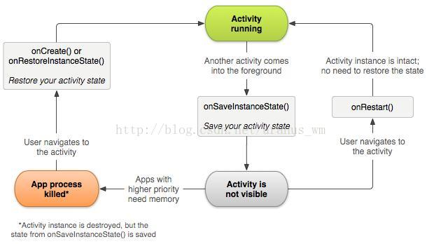 上图表示了activity重新获得用户焦点的两种方式:一种是窗口被销毁,重新创建并恢复原有保存的状态,另一种是窗口失去焦点,恢复到原来的状态。