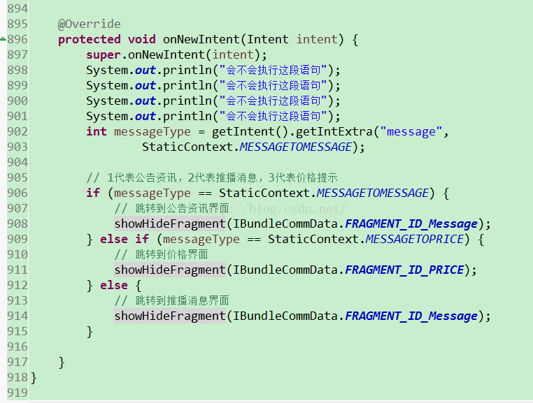 1.Android newIntent方法的使用:http://blog.csdn.net/findsafety/article/details/9664061,newIntent方法的使用在于如果activity已经开启了,并设置了启动模式为: android:launchMode="singleTask"的时候,当再次使用intent来启动这个activtiy的时候就会进入这个方法里面protected void onNewIntent(Intent intent) ,当在接受通知栏的函数里面,就可以传递参数,在该activity的onnewIntent进行判断处理,指定需要显示的fragment界面,如下图: