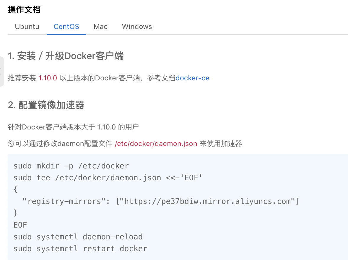 6. 配置阿里云服务器加速,登陆阿里云,找到镜像加速器执行下面代码即可