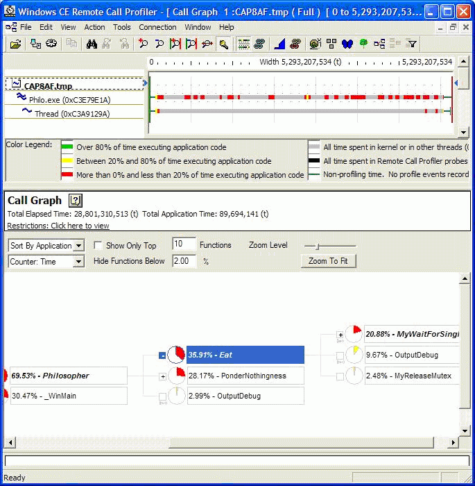 下图显示的是哲学家应用的调用图表视图。此图显示,35%的应用时间花费在函数Eat( ) 上。也许应该了解一下函数的内容!