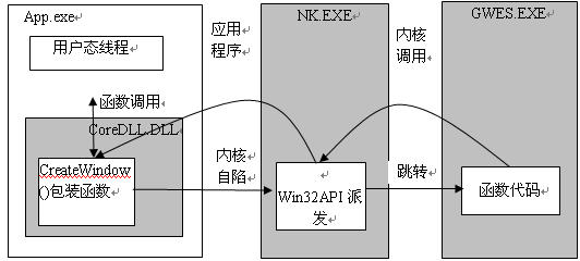 要注意的是CoreDLL.DLL中有些函数并不是系统调用的包装函数,例如字符串处理函数,当应用程序调用这类函数时,就不会发生自陷和进程执行的跳转。