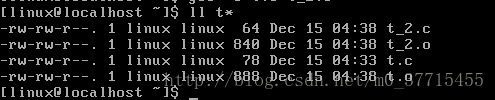 通过命令 “ ll ” 显示t开头的文件 图中可见生成了t与t_2的目标文件t.o和t_2.o
