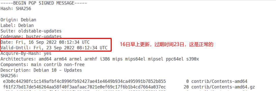 访问它的链接地址 http://mirrors.163.com/debian/dists/buster-updates/InRelease,下载了文件,发现如图情况: