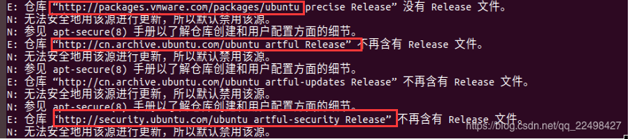 这里可以看到有两个问题,一个是 ubuntu自己的源连不上了[第二三个红框框] ,一个是 vmware 这个软件 [第一个红框框]。