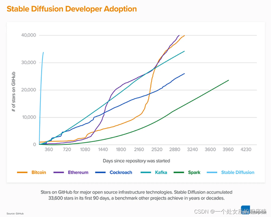 | 影响 | (1)、最初的Stable Diffusion一经发布,就掀起了一场文本到图像模型领域的新革命。Stable Diffusion 1.0彻底改变了开源AI模型的性质,并且在全球范围内催生了数百种新模型。 (2)、Stable Diffusion是最快达到10K Github star星数的项目之一,在不到2个月的时间里飙升至33K星,如上图所示。 (3)、作为目前可用性最高的开源模型,Stable Diffusion在短短2个月的时间里已经被全球超过20万名开发者下载和使用。 (4)、Stability AI面向消费者的产品名为DreamStudio,目前已经拥有超过100万名注册用户—他们共同创建了超过1.7亿张图像。 |