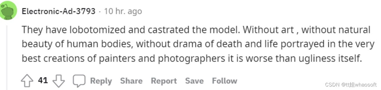 不过在Stable Diffusion的reddit上,一位用户认为「违背了开源社区的精神哲学」,因为删除NSFW内容设立了「审查制度」。
