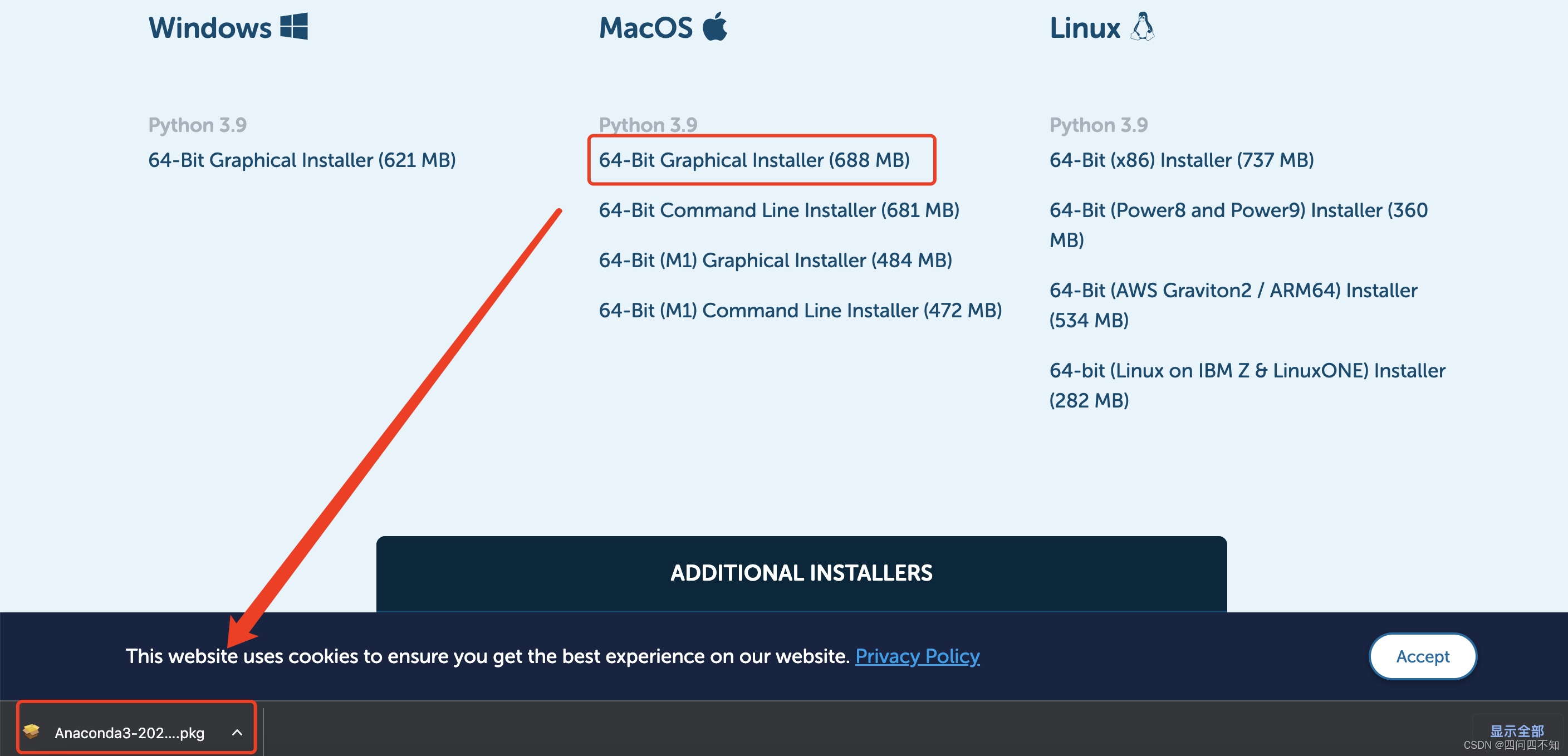1、按照官网流程安装,以mac为例,找到操作系统对应的版本进行下载,如下图mac 64位操作系统的安装包下载,Anaconda | Anaconda Distribution