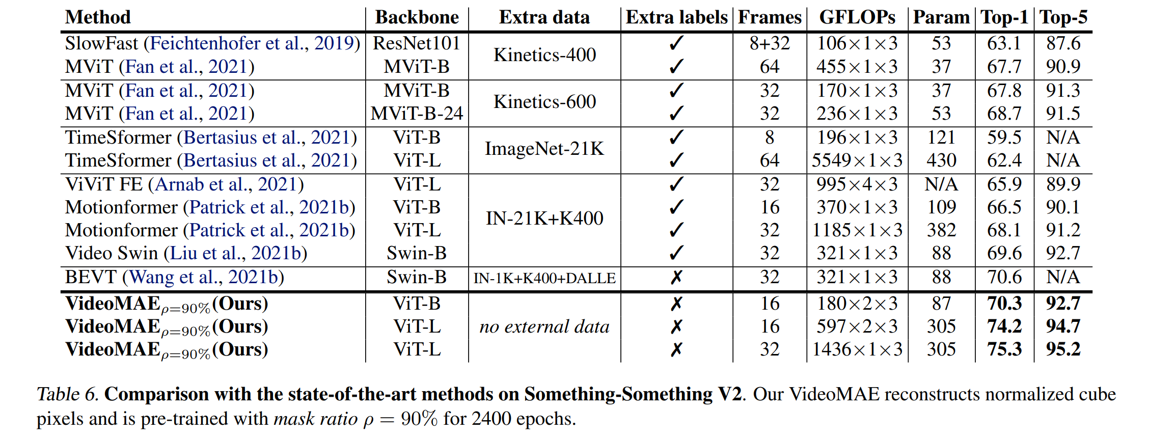 (3) VideoMAE表明,对于SSVP,数据质量比数据量更重要。预训练和目标数据集之间的领域转移是 SSVP 中的重要问题。值得注意的是,我们的带有 vanilla ViT 主干的 VideoMAE 可以在 Kinects-400 上达到 83.9%,在 Something-Something V2 上达到 75.3%,在 UCF101 上达到 90.8%,在 HMDB51 上达到 61.1%,而无需使用任何额外数据。