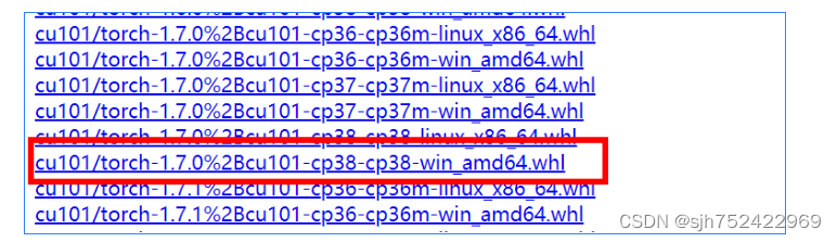 如图所示,就是pytorch的要下载的版本:https://download.pytorch.org/whl/cu101/torch-1.7.0%2Bcu101-cp38-cp38-win_amd64.whl