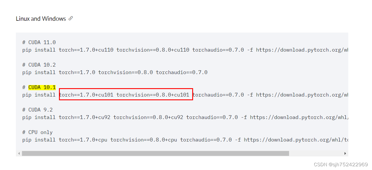 可以看到cuda10.1 对应到的 torch和torchvision的版本