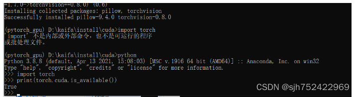 以上就是尊敬花瓣最近收集整理的关于【AI】Windows配置GPU Cuda驱动和Pytorch框架1、Cuda驱动安装2、Annaconda python环境准备3、Pytorch和torchVsion软件安装4、验证测试的全部内容,更多相关【AI】Windows配置GPU内容请搜索靠谱客的其他文章。
