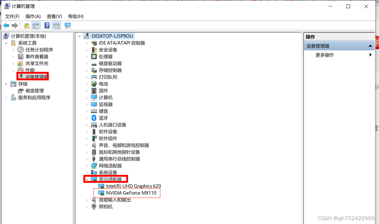 首先看下我们的电脑是否有GPU设备,邮件【我的电脑】,进入到【管理】->设备管理器->显示适配器,可以看到我的GPU显卡是NVIDIA GeForce MX110