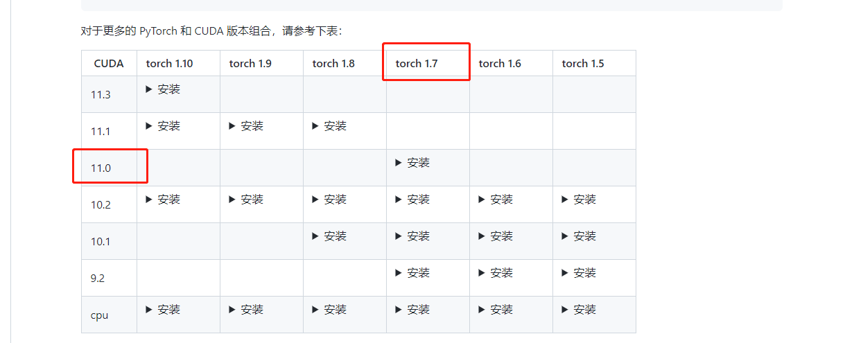 登录https://github.com/open-mmlab/mmcv/blob/master/README_zh-CN.md,选择适合自己电脑安装的torch和cuda版本