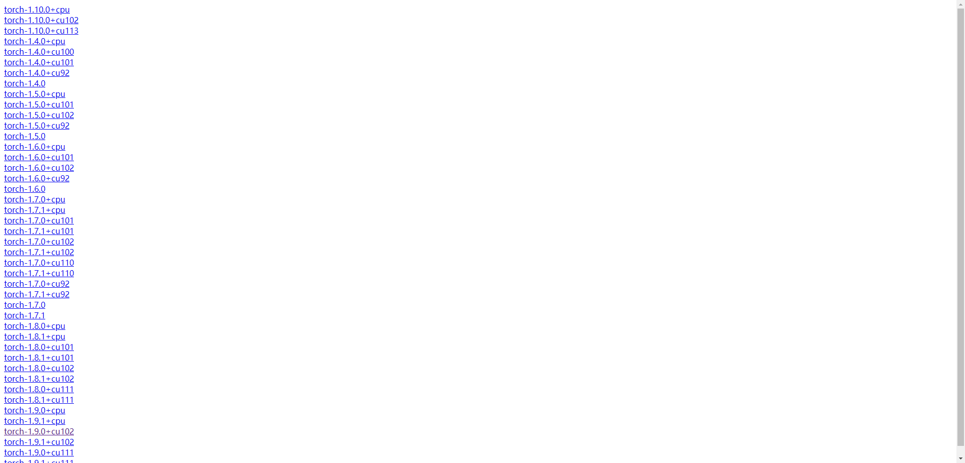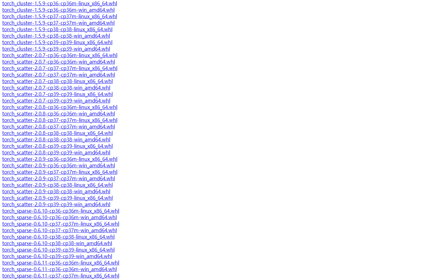 然后根据pytorch和cuda版本选择所需要的whl文件,比如我的pytorch=1.9.0,cuda为10.2,所以我选择torch-1.9.0+cu102,链接过去得到下图,根据自己的python版本选择对应的whl文件就可以了,因为我的python版本是3.6的,所以选择了torch_cluster-1.5.9-cp36-cp36m-linux_x86_64.whl,torch_scatter-2.0.7-cp36-cp36m-linux_x86_64.whl 和 torch_sparse-0.6.10-cp36-cp36m-linux_x86_64.whl