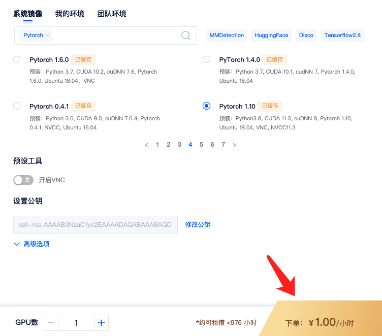 租用机器,按自己需要的环境选择一个环境,我这里选择的是Pytorch 1.10。