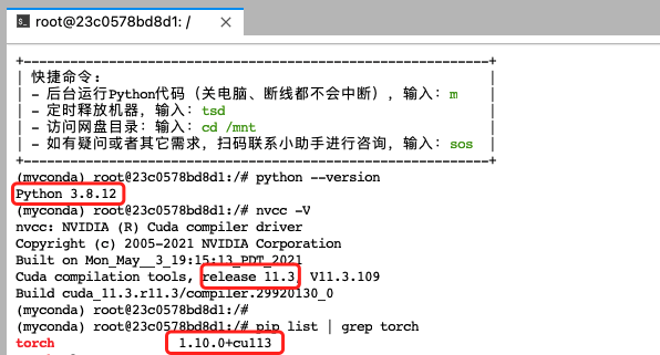 Jupyterlab 里新建一个Terminal 用来安装环境,先检查Pytorch、CUDA版本,如下图可以看到我的环境Pytorch 1.10.0,CUDA 11.3。