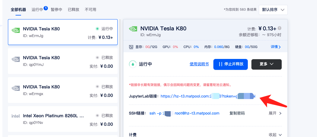 租用成功后点击租用页面的 Jupyterlab 链接。