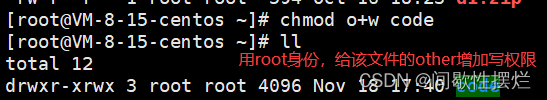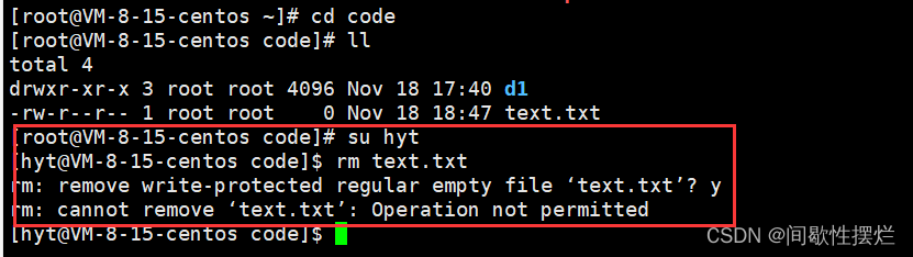 此时再切换用户身份,以other的身份进入目录,虽然该目录仍有other的写权限,但是用户不能删除非自己创建的文件。