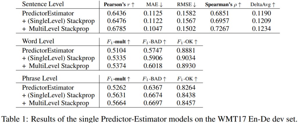 两段神经网络 QE 模型,多级任务学习估计句子、单词和短语的翻译质量,基于端到端的堆叠神经模型 Predictor-Estimator,训练时使用 stack propagation,可以在单级模式下联合训练单词预测模型和 QE 模型。使用带堆栈传播的多级任务学习,在WMT17 QE task 所有QE子任务(句子/单词/短语级)中实现了最佳性能。