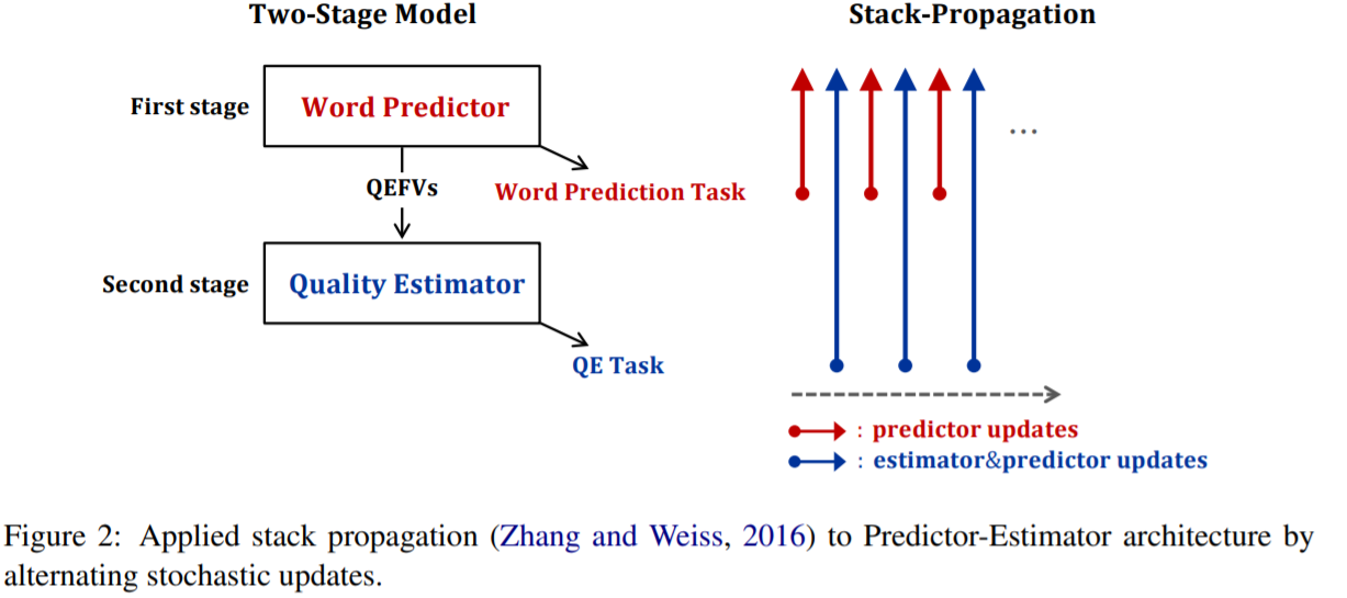 堆叠的单词预测器和质量估计器之间具有连续可微的链接,联合学习两阶段模型,使用堆栈传播交替对单词预测或 QE 目标进行随机更新,实现从质量估计器到单词预测器的反向传播。