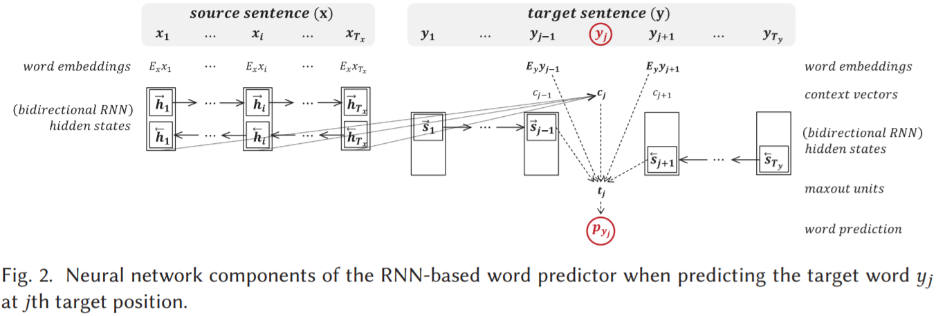 使用源上下文 x 和目标上下文 y-j 预测 j 位置的目标词 yj 的条件概率为: