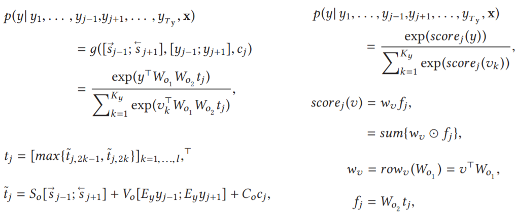左右两个公式是等价的,第一个中的 g 是一个非线性函数,cj 是源上下文向量,由注意力机制产生,Wo1∈R^Ky×q, Wo2∈R^q×l, So∈R^2l×2n, Vo∈R^2l×2m, Co∈R^2l×2n 是相邻层间的权值矩阵,m为嵌入字的维数,n为前向和后向 RNNs 的隐状态维数,l 为 maxout 的维数,q 是最后一个连接到输出层的隐含层的维数。第二个中的 wv 是隐藏层到输出层的输出为词 v 的权重矩阵,fj 是目标句 j 位置的 q 维隐表征。