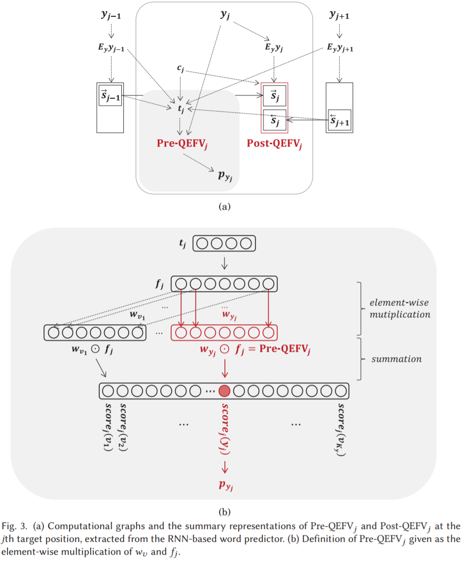 图3(a) 为单词预测器提取的第 j 个目标位置的 Pre-QEFVs 和 Post-QEFVs 的计算图,(b) 为根据 wv 和 fj 的元素乘积计算 Pre-QEFV。