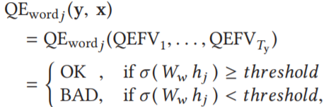 单词级 QE 为二分类任务,将 QEFVs 作为输入序列,生成两类标记 OK/BAD,第 j 个目标位置的二分类函数 QE_wordj (y, x) 为: