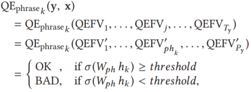 短语级 QE ,将单词级序列标记扩展,输入是短语级 QEFVs 序列,是其组成单词的词级 QEFVs 中归纳所得(平均值)。令 QEFV'_phk 为目标中第 k 个短语 phk 的短语级 QEFV,(QEFV'_1, ..., QEFV'_phk, ..., QEFV'_Py) 是给定的短语级 QEFVs 序列,短语级模型 QE_phrasek (y, x),即第 k 个短语的二分类模型为: