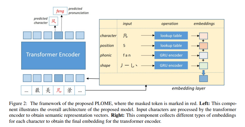 词嵌入模块中,使用字符嵌入(character embedding)、位置嵌入(position embedding)、语音嵌入(phonic embedding)、字形嵌入(shape embedding)。