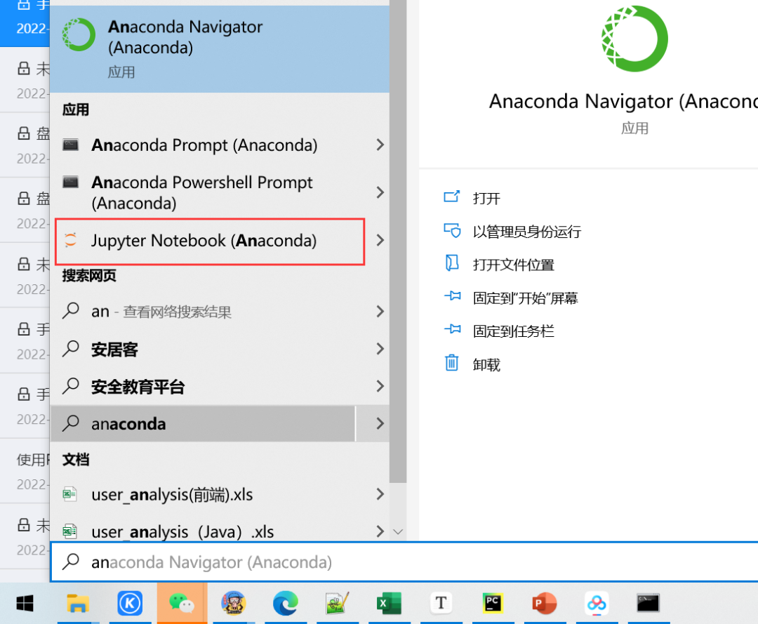 按说一般是可以正常启动的了,基本上没啥问题。但是也有的小伙伴们,会遇到问题,不过一般的坑,前人都踩过了,网上很多相关的报错解决方法,一般环境变量问题比较多一些。首次启动,点开左下角的windows图标,然后输入关键词Anaconda,有个jupyter notebook显示,点击下就可以启动了,如下图所示: