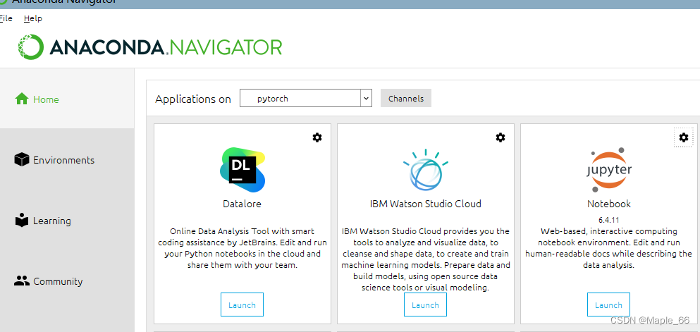 直接使用已安装的jupyternotebook会显示在主环境(base)下,可在anaconda navigator中选择所用的虚拟环境,之后打开jupyternotebook即可