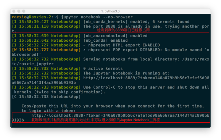 例图中由于在完成上面内容时我同时启动了多个Jupyter Notebook,因此显示我的“8888”端口号被占用,最终分配给我的是“8889”。