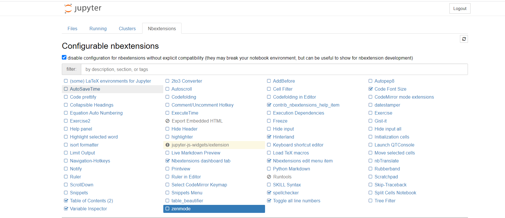 此时打开Jupyter Notebook后点击Nbextensions就可选择需要的插件
