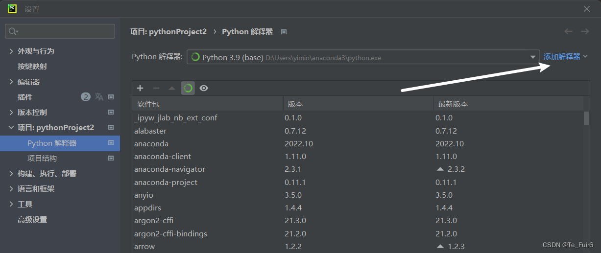 记住我们所需要的解释器的路径,在编辑配置中,要选择与你刚刚的环境路径一致的解释器,如果在这解释器列表里找不到正确的解释器,进入:文件--设置(或者Ctrl+Alt+S打开Setting)--python解释器--添加解释器,安装对应的目录添加