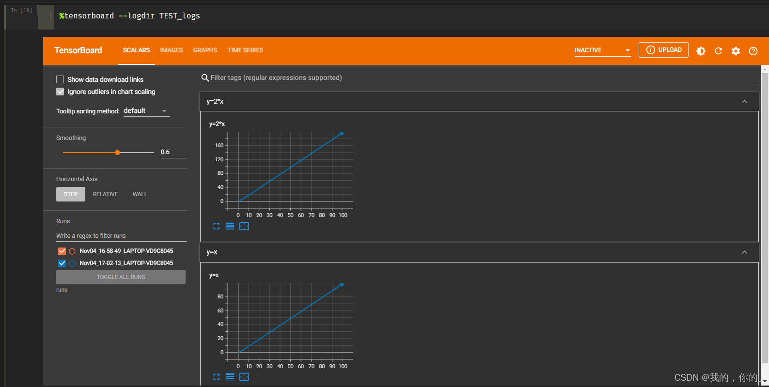 - writer=SummaryWriter("TEST_logs"):初始化,“TEST_logs”代表文件名,代码运行将会创建TEST_logs文件夹,并将event文件存放在当前文件夹下;